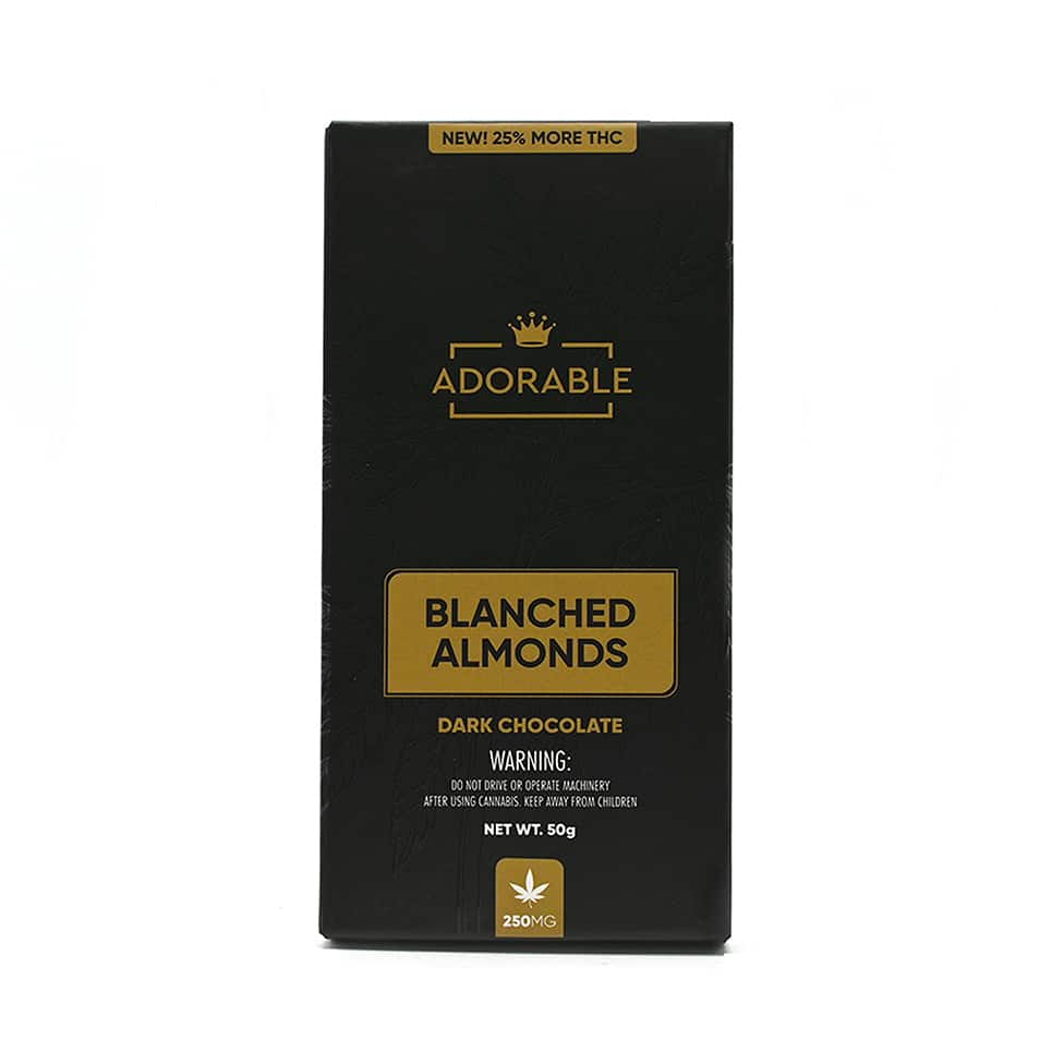 Buy 250mg THC infused Dark Chocolate – Adorable Online Europe – Each bar contains 250mg of THC16.6mg THC per square pieceBlanched Almonds Dark ChocolateIngredients: Cocoa Butter, Whole Milk Powder, Soy Lecithin, Natural Vanilla Flavour, almonds, Cannabis Extract.