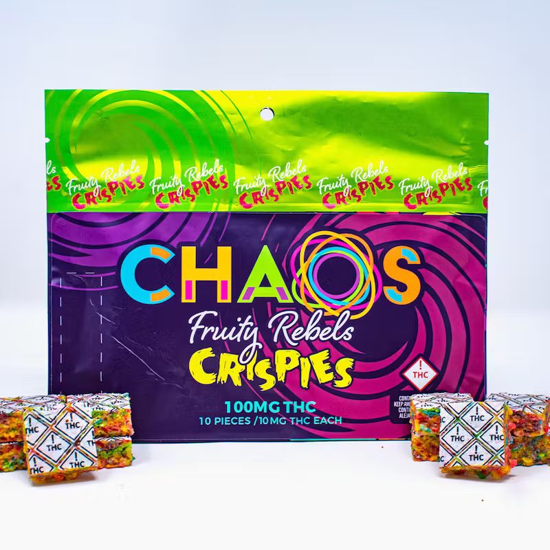Order Chaos Crispies Fruity Rebels 100mg Online Europe – Relive your childhood with fruity rice crispy squares! Handmade from fresh rice cereal and gooey marshmallows then infused with hybrid distillate for a delicious bite-sized edible.