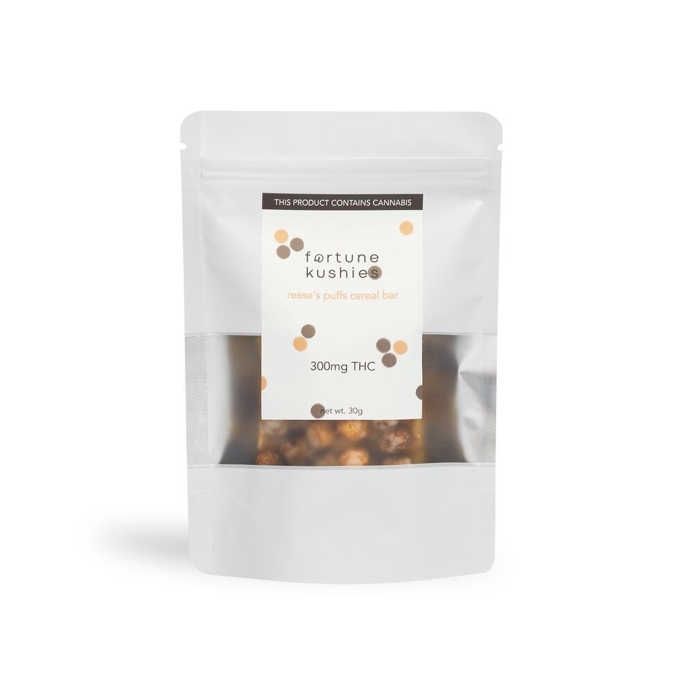 Fortune Kushies – Reese’s Puff Cereal Bar 300MG THC – The perfect blend of nostalgia and THC in one square.TOTAL THC CONTENT: 300MGINGREDIENTS: Reese’s Puffs cereal, THC distillate, honey, coconut oil, marshmallows