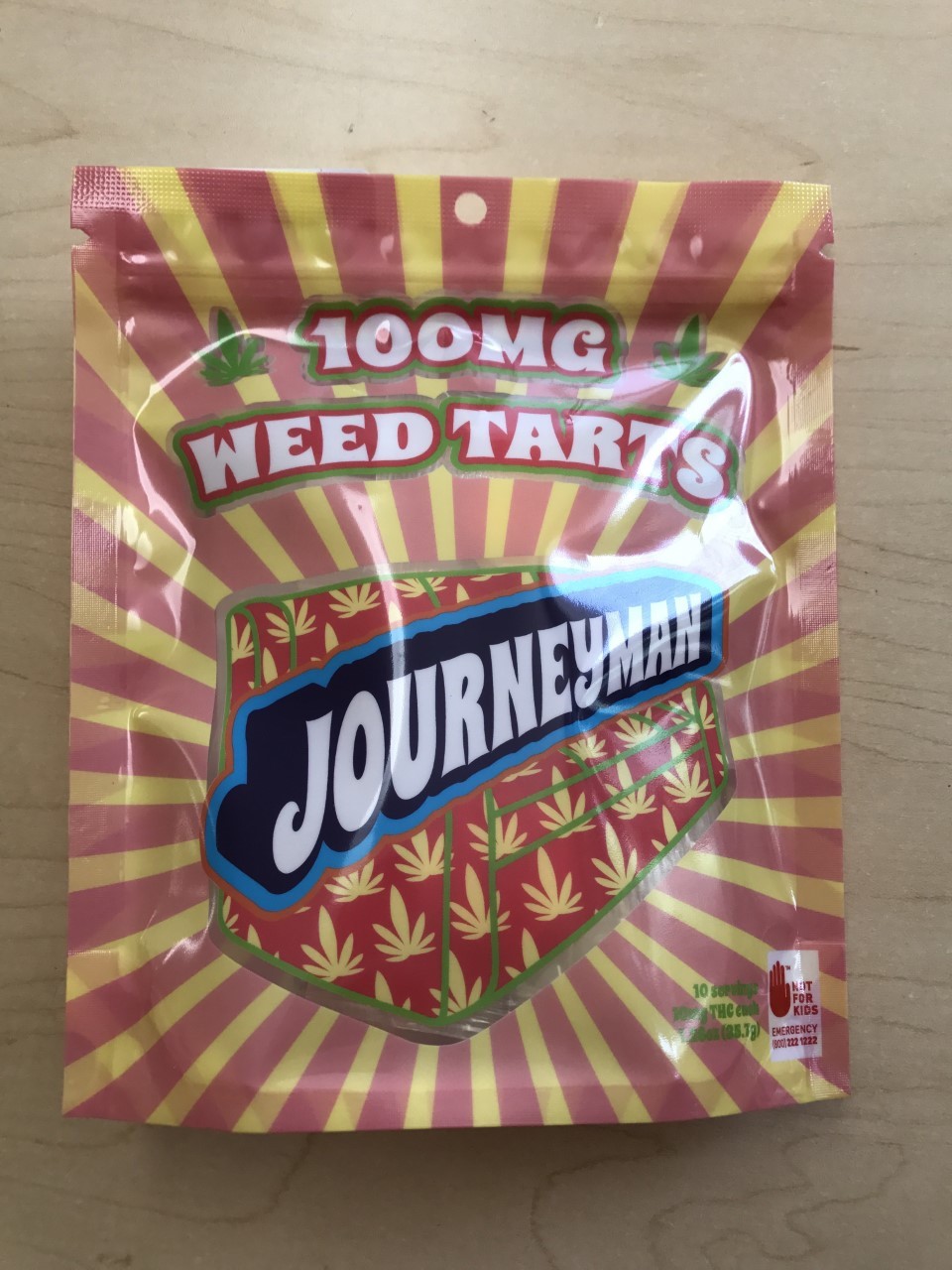 Journeyman Weedtarts 100mg 10 pack Variety:Hybrid Producer:Botanica Seattle Description:Cherry, green apple, and lemon pieces of sunshine picked off
